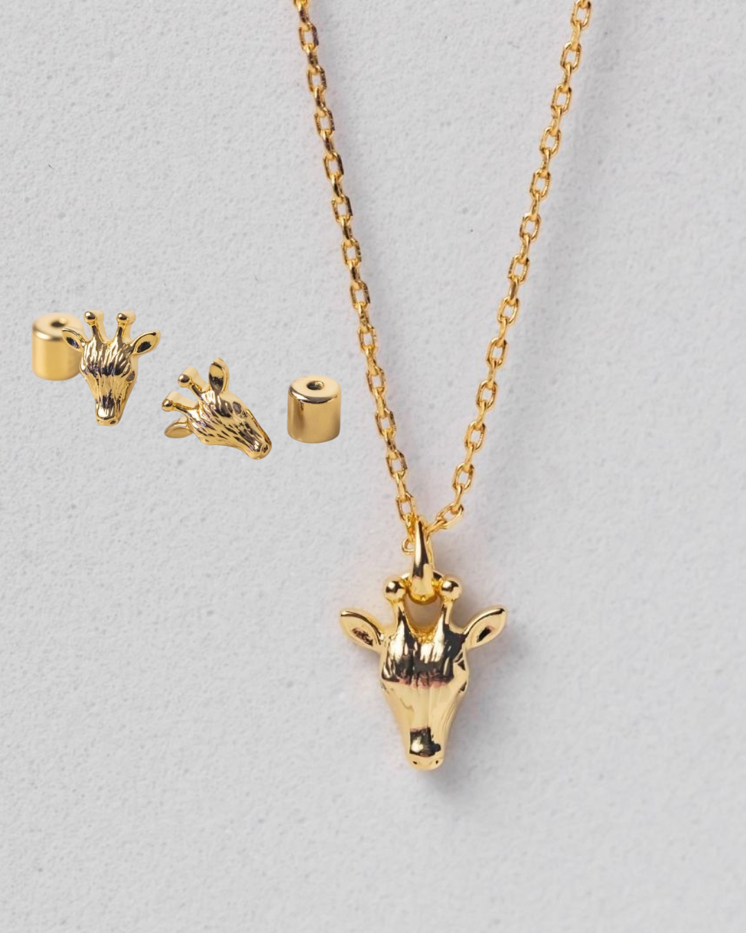 Handcrafted from brass and plated in 14k yellow gold, this charming duo features delicate animal motifs accented with pavé-set 0.5mm round-cut cubic zirconia for a subtle, radiant sparkle. The adjustable diamond-cut chain and secure barrel-back studs make this set as versatile as it is meaningful. Choose from the Elephant, Giraffe, Cheetah, or Lion—each symbolizing strength, grace, and individuality. A timeless bundle designed to celebrate your unique spirit and a perfect gift for someone special.